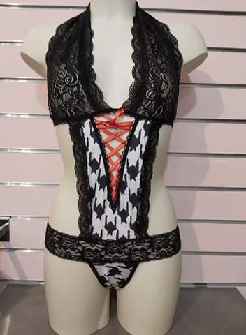 Body string en dentelle noire et lycra imprimé pieds de coq avec son laçage central en satin rouge. Convient du 85B au 95C pour le haut et du 36 au 40 pour le bas. Cou et dos à nouer.